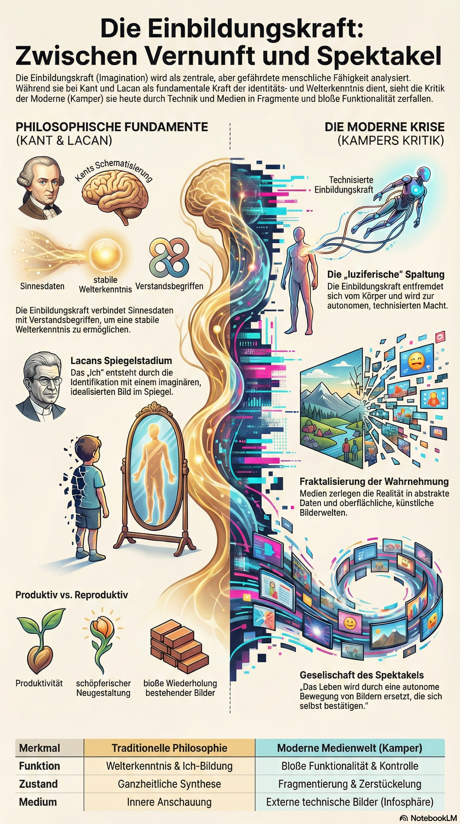 Dieser Text untersucht die Philosophie von Dietmar Kamper, wobei insbesondere seine Kritik am Imaginären im Kontext von Kant und Lacan beleuchtet wird. Während Kant die Einbildungskraft lediglich als funktionales Werkzeug der Erkenntnis betrachtete und ihre unberechenbaren Aspekte ausgrenzte, begreift Kamper sie als eine fundamentale menschliche Kraft, die eng mit dem Körper und dem Begehren verknüpft ist. In Anlehnung an Lacan wird das mediale Imaginäre als eine Art Schutzschild analysiert, das eine künstliche Ganzheit simuliert und den Menschen in einer Welt der technologischen Spiegelbilder isoliert. Kamper warnt davor, dass moderne Medien den lebendigen Körper in statische Zeichen verwandeln und so eine totale Immanenz schaffen, die keinen Raum für das Außerhalb lässt. Um diesen Strukturen zu entkommen, schlägt er ein "Körperdenken" vor, das durch essayistisches Schreiben und künstlerische Experimente die Grenzen der normierten Sprache durchbricht. Letztlich plädiert die Quelle für eine historische Anthropologie, welche die schöpferische Unberechenbarkeit der Phantasie gegenüber der rein technischen Kontrolle verteidigt.